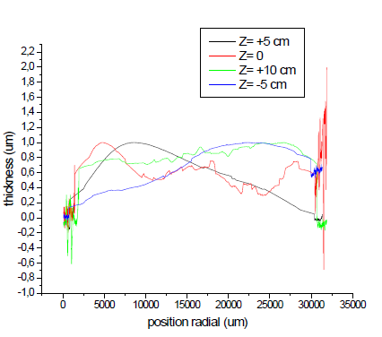 Figure 11: Radial profiles of Ti coatings measured with the profilometer for different axial positions