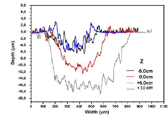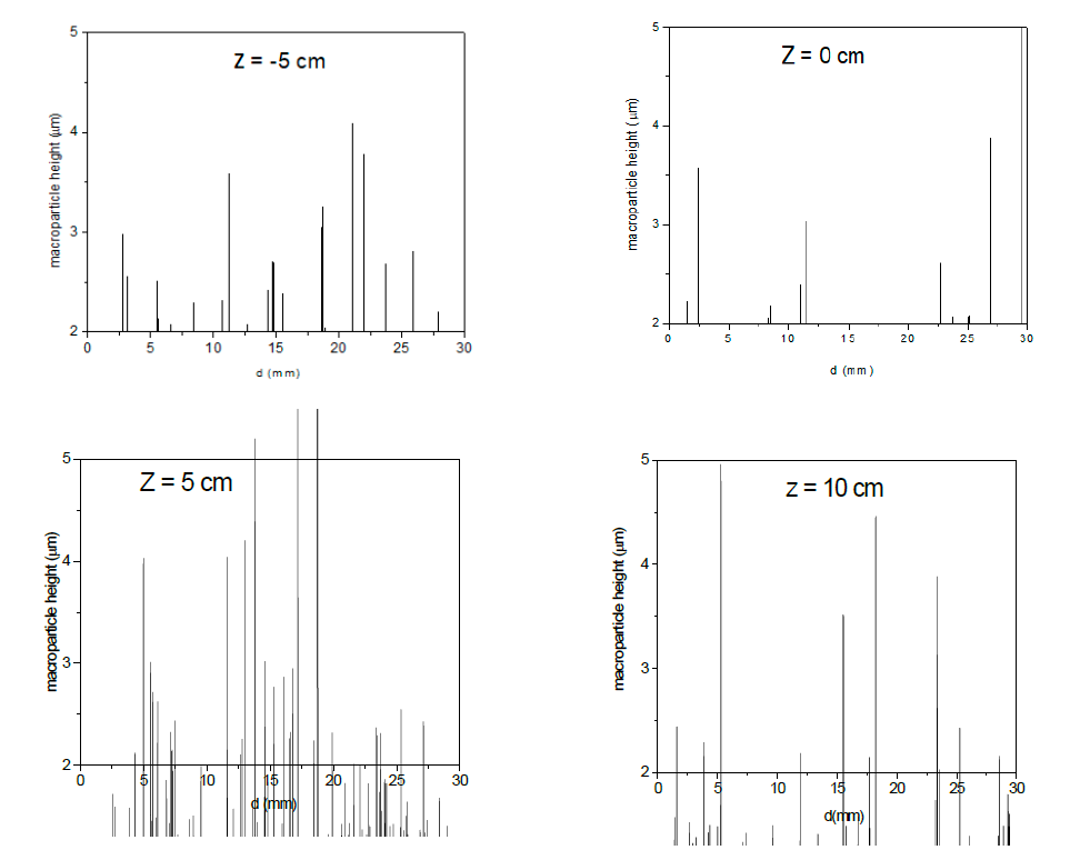 The titanium films grew at different positions have macro-particles with heights higher than 2 μm, along a diameter d, at different Z positions, -5cm, 0, +5cm and 10cm, the signals were obtained with a profilometer and shown in Fig. 14.