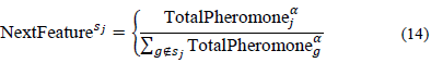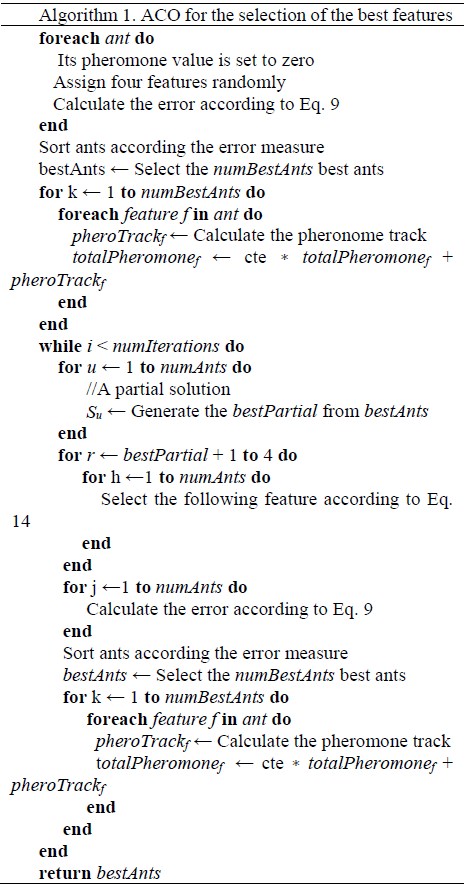 d ij is a function that describes the performance of the solution when the node j has been incorporated. For each iteration, the feature which is selected next will be the one which obtains the maximum value when eq. 14 is applied.