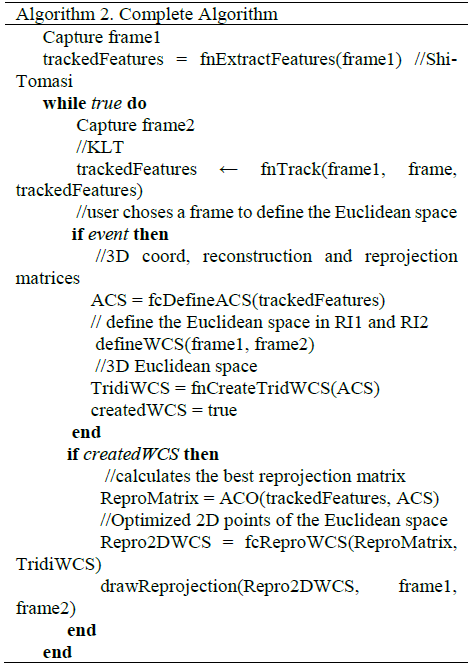Algorithm 1 presents the methodology which clarifies how ACO should be used for the selection of the best features. The points (represented by an ant) are used to calculate the reprojection matrix which minimizes the registration error. This means that the matrix-according to ACO-accurately reprojects the extracting points. Algorithm 2 presents the complete algorithm for the whole process.