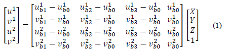 Consider an affine space defined by four non-coplanar points {P0, P1, P2, P3} ϵ R3 where P0 is the origin of the affine space, and {P1, P2, P3} are three basis points. The tridimensional coordinates [X Y Z]T of the extracted features can be determined in the affine space if the projections of each feature point and the projections of the four points defining the affine space {P0, P1, P2, P3} are known in two different views ([uj vj]T ; j=1, 2) (see eq. 1).