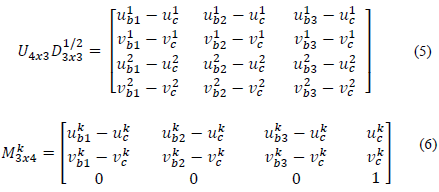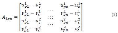 Where [u j pi - u j pi ] (j=1, 2; i=1, 2,. . . , n) represents the projection of the 3D affine points in the two different views and [u j c - v j c ] (j=1, 2) is the center of mass of these projections. By SVD decomposition, the matrix A is expressed in eq. 4 in the form: