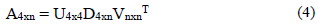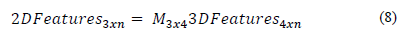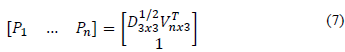 where U4x3, D3x3 and Vnx3 are the upper sub-matrices 4x3, 3x3 and nx3 of U, D, and V respectively. With this factorization, reconstruction and reprojection matrices can be formulated by eq. 5 and 6 respectively.