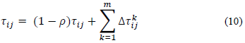 Although, in the literature, several methods based on ant optimization have been proposed, we choose the Ant System (AS) method which is based on the permanent updating of the pheromones for all m ants that have built a solution. The total pheromone of each node is computed according to eq. 10.
