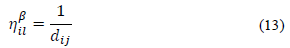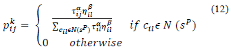 where s P is a partial solution, N(s P ) are the possible nodes to be selected and l is a node not yet visited by the ant k. Finally, η β il is obtained with eq. 13.