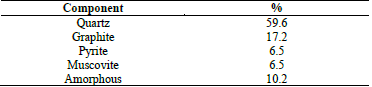 The scanning electron microscopy analysis was performed in an equipment FEI Inspect S50, for which 10 g of sample was prepared and pulverized to D80 of 75 μm. A powdered sample of 1 g was taken which is placed in an aluminum frame with carbon adhesive. In several samples, it was observed that the carbonaceous matter was composed of a high percentage of carbon, aluminum, and silicates, common elements in the metamorphic rocks of sedimentary origin with carbon content. This indirectly corroborates the petrographic characterization of the ore (graphitic schists - carbonaceous slates). For the XRD analysis, the sample was also finely pulverized to D80 of 75 μm. This analysis was performed in a PANalytical XPert Pro equipment. The composition of the sample is as follows in Table 1.