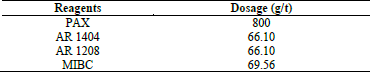Table 2: Reagents use and dosages in flotation tests.