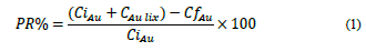 In eq. (1) CiAu and CfAu are the initial and final gold concentrations of the solution with 5 ppm of gold. The CAu lix is the concentration of gold leached in the solution without the addition of a standard solution of gold (cyanide amenability solution). This test was done only for the concentrates obtained in the cleaner stage, as it was considered the product with the lowest carbon content.