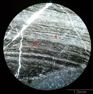 Figure 2: Mineralogical analysis by optical microscopy of the sample showing stratification of silica minerals (1) and carbonaceous matter (2).