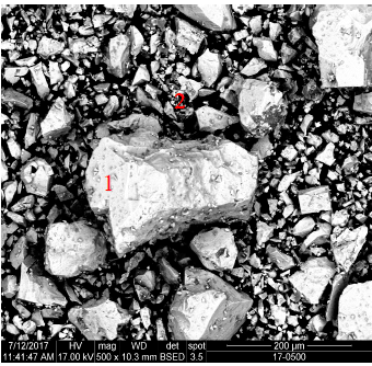 Figure 4: SEM micrograph of the cleaner concentrate obtained using maltodextrin as a depressor for carbonaceous matter. (1) We can observe clean pyrite grains. (2) Carbonaceous matter asssociated with pyrite grains in cleaner concentrate.