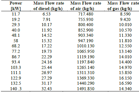 Costa et al. [17] varied the engine power in a range between 10 kW and 150 kW, with increments of 10 kW and different mass flows of diesel fuel and methane for each variation.