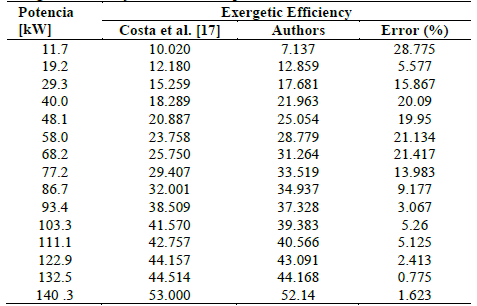 Fig. 4 shows the behavior of the exergetic efficiency as a function of the engine power, where it is evident that for higher power values, the second law efficiency improved significantly. When increasing the load from 80 kW to 150 kW, this efficiency increased by 55.55% until reaching its maximum value; this is due to greater use of the exergy contributed by the fuels. The highest error calculated was 28.775% with respect to the data revealed by the study of the previous author, as shown in Table 4.