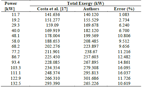 As the load on the engine increased, the total exergy input increased, as shown in Fig. 5. From 80 kW to 150 kW, the total exergy input increased by 17.04%. The calculated data revealed a maximum error of 16.1% compared to the data provided by Costa et al. [17], as shown in Table 5