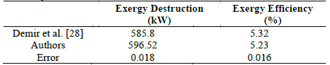 In both cases, it is possible to show that the behavior is congruent since by obtaining higher exergy destroyed using the model proposed in this article, it was expected that the exergetic efficiency was lower than that of Demir et al.