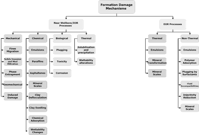 Figure 1: Main mechanisms of formation damages generated in near-wellbore/IOR operations and EOR processes.