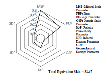Figure 2: Formation damage percental representation in a spider graph. For the specific case represented by the spider graph, a high percentage of damage by mineral scales is observed approximately 30%, followed by a fines migration damage with 20%, and with a lower degree of condensate damage, induced, Kr and organic.