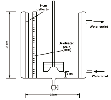The experiments were carried out in a cylindrical glass reactor temperature-controlled with water, with a total capacity of 1 liter (800 mL effective volume), with an internal diameter of 10 cm and a height of 14 cm, with a flat bottom, equipped with four 1.0-cm wide 316L stainless steel deflectors. The stirrer’s propeller drive, made of 316L stainless steel, has six blades at its base, spaced uniformly on a circular disc and two blades on the surface of the disc, mounted at the center of the mixer-settler at a distance of 3 cm from the bottom of the reactor. The schematic of the reactor and the stirrer is shown in Figure 1.