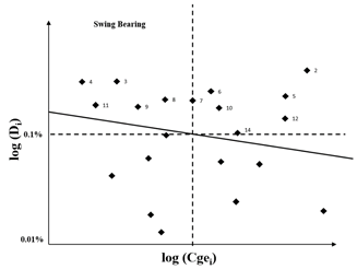 Fig. 2 presents the Cge versus the unavailability. Again, the upper right quadrant allows for identification of the components with the most critical record of events, but this time, they are used to generate greater Cg. Nonetheless, this study considers components above the overall cost line (oblique line) comprising both those that generate higher overall cost and higher unavailability.