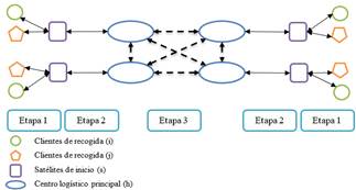 Para simplificar la nomenclatura de las rutas que se generan en cada etapa, los satélites asociados al cliente final se definen como el conjunto s´; los centros logísticos asociados al satélite final h’ y si hubiese un centro logístico intermedio como h´; la unión entre estos nodos se denota con un guion; es decir, (h´-s´-j) denota que se genera una ruta entre el centro logístico final h´y el satélite asociado s´para atender al cliente de entrega j.