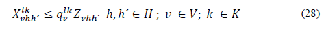 Las ecuaciones (17) a (22) garantizan que en las rutas generadas se transite la cantidad total de paquetes que se generan en los clientes de inicio. Las restricciones (23) a (24) garantizan que la cantidad de carga asignada a un vehículo ya sea con sobrecarga o sin ella, es menor a su capacidad en función de la ruta que transite. Las ecuaciones (26) a (28) definen el límite de la capacidad de sobrecarga entre centros logísticos principales y satélites, mientras que la ecuación (29) establece la conservación de flujo de entrada y salida en los centros logísticos principales. Las ecuaciones (30) a (32) determinan el tipo de cada variable.