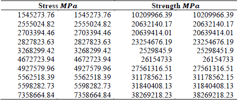 Step 8. From eq.(24 and 25), the maximum and minimum values of the stress are σ1=15036225.81 and σ2=3249483.65 and for the strength they are σ1=47071848.24 and σ2=22623160.98.