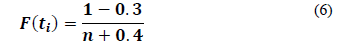 with Y i =ln(-ln(1-F(t i )),b 0 =-β ln(η), and x i =ln(t i ). In practice F(t i )in Eq. (4) is estimated by the median rank approach to estimate the corresponding reliability of a data set and is given by [16]: