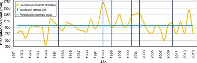 Figura 3: Precipitación acumulada de la estación meteorológica de Brandsen entre los años 1972 y 2015. Las líneas azules representan los años en que se registraron inundaciones extensas en la serie Landsat.