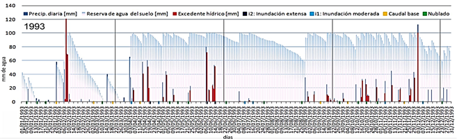 Durante el año 1993 se registraron 31 imágenes satelitales de las cuales 15 poseían una cobertura nubosa que no permitió clasificar la condición hídrica del terreno (Fig. 4). La condición de caudal base se registró en 7 imágenes, mientras que 9 presentaron inundaciones. De estas últimas, 6 fueron inundaciones moderadas (i1) y 3 fueron clasificadas como inundaciones extensas (i2), en donde el excedente hídrico acumulado fue de 70,5 mm para abril, 71,5 para inicios de junio y de 93,5 para mediados del mismo mes. Si bien durante el mes de febrero los excedentes hídricos superan el valor umbral de 70 mm (Fig. 4), la serie Landsat no posee registro de capturas durante los 4 días consecutivos posteriores al evento. Asimismo, se destaca que en diciembre de este año, el excedente hídrico alcanza un valor cercano a los 100 mm. Sin embargo, la imagen satelital de la serie Landsat se registra 5 días posteriores al excedente obtenido, por lo que la fuerte evapotranspiración de este periodo hace que al momento de la captura el excedente acumulado sea bajo y solo pueda observarse una inundación moderada (i1).