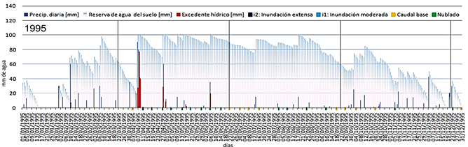Por su parte, los balances hídricos diarios permitieron relacionar los mm de agua de excedentes hídricos derivados de las precipitaciones y la condición de las imágenes satelitales respecto a la presencia de agua en superficie.