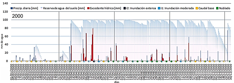 Por su parte, durante el año 2000 se pudieron observar 72 imágenes satelitales Landsat. Respecto al balance hídrico realizado para este año, la condición de caudal base fue registrada en 28 imágenes satelitales, en tanto que 31 imágenes presentaron una cobertura nubosa que no permitió ver la condición del terreno (Fig. 6). Las inundaciones fueron registradas en 13 capturas, 11 correspondientes a una inundación moderada (i1) y 2 a una inundación extensa (i2). Cabe aclarar que las 2 inundaciones extensas registradas se corresponden a dos días sucesivos del mes de mayo, en donde la acumulación de excedentes hídricos fue de 181,6 mm y 142,2 mm respectivamente. Por último, si se observa el balance a inicios de mayo, durante los días previos ocurren grandes precipitaciones con sus correspondientes excedentes hídricos, sin embargo, la captura de la imagen satelital ocurre posteriormente a 4 días del último excedente hídrico registrado, por lo que solo se observa una inundación moderada. Respecto al resto de los excedentes hídricos observados, ninguno supera los 50 mm y la condición observada en las imágenes satelitales fue de inundación moderada o de caudal base cuando la captura fue posterior a 5 días de los excedentes registrados (Fig. 6). En este sentido, el análisis realizado detallado para los años 1993, 1995 y 2000, utilizando excedentes hídricos acumulados e inundaciones registradas en las imágenes Landsat, pudo corroborarse en todos los balances hídricos para los años seleccionados.