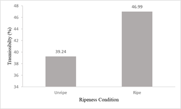 The average transmissibility obtained for ripe fruit branches was higher than for those unripe. Studying the physical properties of coffee, [3] the average fruit mass of the coffee plant was determined and, as a result, ripe fruits presented 24.64% more mass when compared to those unripe. The coffee branch does not change rigidity with variations of fruit maturation, thus, a sample with more mass will suffer greater deflection during a vibratory movement. Higher deflections imply in higher accelerations, thus ensuring greater transmissibility of vibration energy. Analyzing the average mass of the samples used in the experiment, a value of 54.7 g was obtained for ripe samples and 50.6 g for unripe samples.
