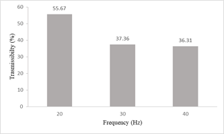 The frequency of 20 Hz presented greater vibration transmissibility, surpassing the higher levels of 30 and 40 Hz.