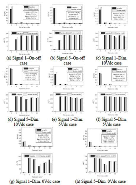 The Norton model, obtained from the frequency sweep, managed to describe the behavior of the on-off and dimmable luminaires when the supply voltage signal had more than one odd harmonic.