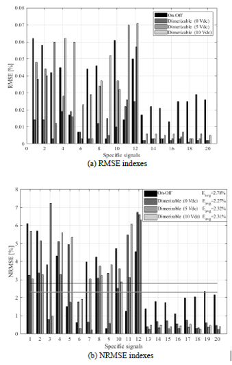 Fig. 9 shows a comparison of the RMSE and NRMSE indices that evaluate the ability of the Norton equivalent model to estimate the current of the on-off and dimmable luminaires in three states. RMSE estimation errors are less than 0.08 A for all cases, while NRMSE errors range between 0.30 and 7.20%, whose average errors are significantly similar in the four cases (2.78, 2.27, 2.32, and 2.31%), which indicates a satisfactory performance of the Norton models. In short, this model describes the harmonic interaction between voltage and current; therefore, it is a useful tool to study the harmonic distortion effect caused by nonlinear loads.