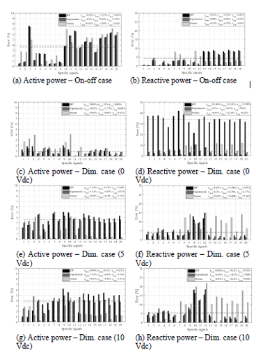 Fig. 10 illustrates the calculated percentage errors between the measured and estimated values of active and reactive powers using the three models for the four operation cases that were analyzed. In the case of the on-off luminaire, the average percentage of active power estimation for each model was similar (3.55, 3.57, and 3.82), while the reactive power was estimated with a lower average error of 2.85% using the Norton model. The comparison of the errors of active and reactive powers obtained from the three analyzed load models for the on-off luminaire are illustrated in Figs. 10a and 10b.
