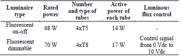 Table 1 lists the general characteristics of the utilized luminaires based on the rated power, type, and number of tubes in the case of fluorescent luminaires, active power for each fluorescent tube, and type of luminous flux control used by dimmable luminaires.