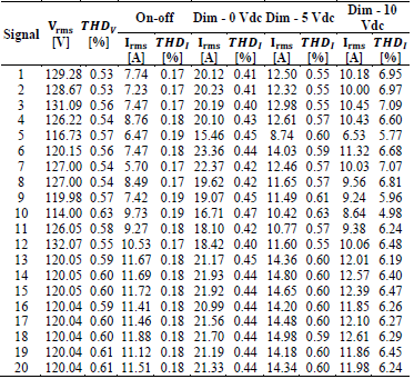 Fig. 4 illustrates the results of the current signals for the four cases in the operation of the luminaires, where they are inputted with six specific voltage signals. Visually, a significant distortion of the current signal is not appreciated. Specifically, the values of 𝑇𝐻𝐷 𝐼 vary between 5.70 and 12.00% for the on-off and dimmable luminaires with maximum luminous flux; however, the value of this parameter increases when the dimerization of the luminous flux is intensified, reaching maximum values of 15.45 and 23.35%.