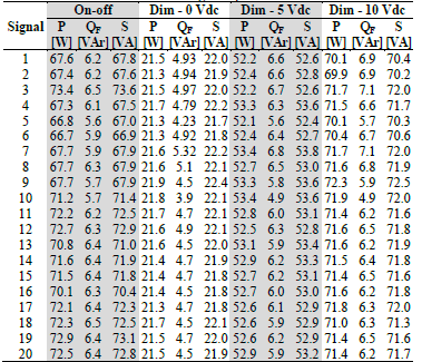 Tables 2 and 3 list the values of Vrms, Irms, P, QF, S, THDV, and THDI measured from the operation of the luminaires using the 20 special voltage signals (scenario d). These data indicate that the luminaires have a capacitive behavior, where the magnitude of Q corresponds to the application of the Fryze model; the power factor is measured to be at values over 0.97 in all cases. Similarly, it is possible to observe that the intermediate operation (5 Vdc) of the dimmable luminaire does not represent a value close to half of the nominal power as the current and powers demanded are close to 0.4 A and 52 W, respectively, which are values similar to those obtained during the maximum operating state (10 Vdc), which are 0.5-0.6 A and 71 W.