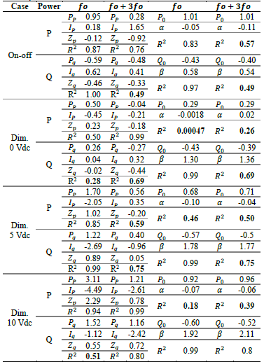 Table 4: ZIP and exponential model parameters for the On-off luminaire and three operation states of dimmable luminaire