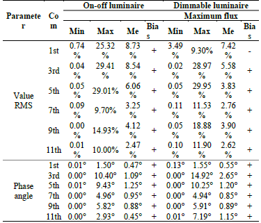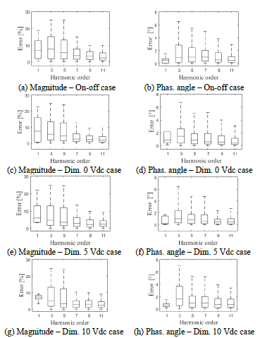 Table 5 lists the data of the percentage and absolute errors of estimation of the magnitude and phase angle, respectively, for each fundamental and harmonic component of the current signals for the on-off and dimmable luminaries in their maximum operating state.