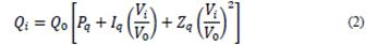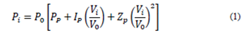 The ZIP model is composed of three types of loads: constant impedance (Z), constant current (I), and constant power (P). This model is described by polynomial eqs. (1) and (2), which allow the estimation of the active (P i ) and reactive (Q i ) powers consumed for a voltage V i , respectively; the coefficients of both equations must comply with the restrictions presented in eqs. (3) and (4) [9,10]. P 0 and Q 0 represent the nominal values of the active and reactive power for a nominal supply voltageV 0 , respectively; P P , I P , and Z p represent the corresponding coefficients of the ZIP model for active power; moreover , P q , I q , and Zq represent the coefficients of the ZIP model for reactive power.