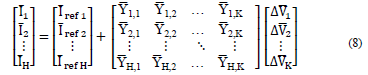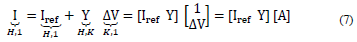 The Norton equivalent model based on the coupled admittance matrix method linearizes the behavior of a nonlinear load at a reference operating point for various harmonic orders. Eqs. (7) and (8) present the model in a compact and extended matrix form, respectively. I is the vector of currents, Y is the coupled matrix of admittances, ΔV is the variation of the voltage signals, and I ref is the vector of reference currents [11], whose dimensions are given by H and K, which represent the highest odd harmonic order used for current and voltage signals, respectively.