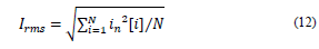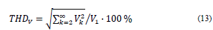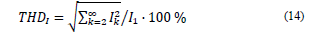 The total harmonic distortion index of the voltage and current can be determined using eqs. (13) and (14), respectively, where k is the harmonic component number, V 1 and 𝐼 1 are the RMS values of the fundamental voltage and current components, respectively, and 𝑉 𝑘 and 𝐼 𝑘 are the RMS values of the harmonic components k of voltage and current, respectively.