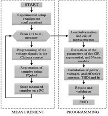 The calculation of the power and distortion parameters and the parameters of the load models, i.e., ZIP, exponential, and Norton equivalent, was performed based on the analysis of the measurements in a tool developed in MATLAB. Fig. 3 presents the structure of this study, from the assembly of the equipment to obtaining the results.