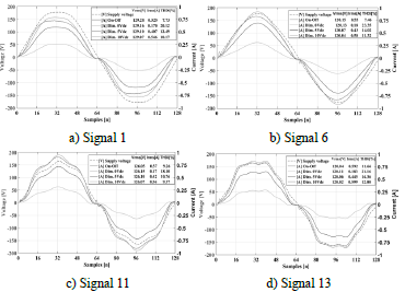 d) Specific voltage signals. We selected 20 specific voltage signals to analyze the performance of the load models, i.e., two voltage signals obtained in the low-voltage bus bar of the Edificio de Ingeniería Eléctrica (Signals 1 and 2); a voltage signal from the power grid of the Edificio de Alta Tensión - UIS Campus (Signal 3); a voltage signal at the residential level in the city of Bucaramanga (Signal 4); two typical voltage signals in BT distribution networks: flat-top signals present in residential networks (Signal 5) and pointed-top signals present in industrial networks (Signal 6) [28]; three voltage signals corresponding to research articles (Signals 7, 8, and 9) [22]; a set of three voltage signals (Signals 10, 11, and 12); and eight signals obtained from the Appendix of Nassif et al. [11] (Signals 13-20).