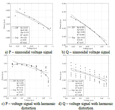 It was determined that the ZIP and exponential models do not exhibit a satisfactory behavior when the waveform of the voltage signal changes owing to the presence of harmonics.