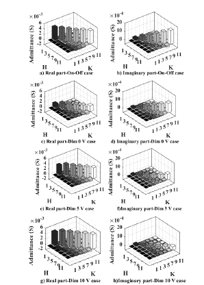 Fig. 6 shows the admittance matrices of the Norton model for the four cases that were studied (on-off luminaire and the three operating states of the dimmable luminaire), which allow us to appreciate that the diagonal has a dominant presence with respect to the other components of the matrix, which is owing to the greater intensity of the relationship between the harmonic voltage and current components of the same order.