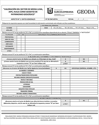 A partir de las características de cada una de las áreas de enfoque descritas y el procesamiento de datos según la metodología de valoración del patrimonio geológico y paleontológico inmueble propuesta por el SGC [28] como principal metodología en este estudio, se propusieron los enfoques aplicables al sector de Media Luna en Aipe, Huila, teniendo en cuenta los puntos de control reportados en este estudio y las características más sobresalientes documentadas en cada uno de ellos a partir de la recopilación bibliográfica y los datos obtenidos con la aplicación de las encuestas.