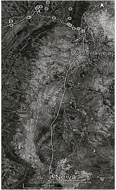 Figura 3: Recorrido total realizado por la Ruta nacional N°45 desde la ciudad de Neiva (A) hasta el desvío sobre la Ruta nacional N° 45 hacia la vía a Planadas (B), Sinclinal de Media Luna (C) y final de la ruta (D)