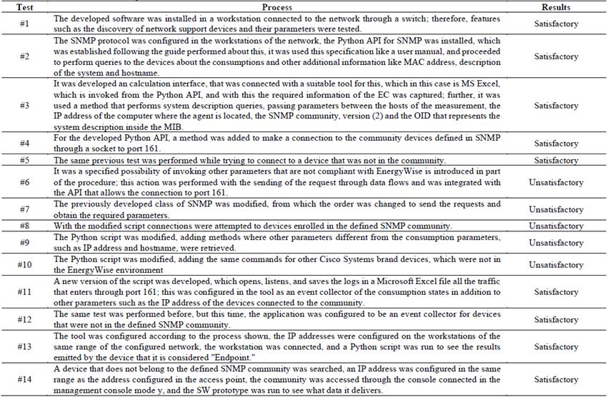 As mentioned above, functional tests were performed, such as activating some hosts on the network, and those with a technical nature, such as forward traffic between hosts, which was evidenced in the collection of requirements. The functional tests performed with the developed tool allowed obtaining the requirements, which are consulting the OID of the SNMPv2 objects of the devices present in a data network. The tests were also performed with the SNMP API, hence elucidating the operation and how to implement an EM process in a GNS environment, which was extracted in the queries to the resident SNMP agent and activated on network devices. See the test results in Table 2.